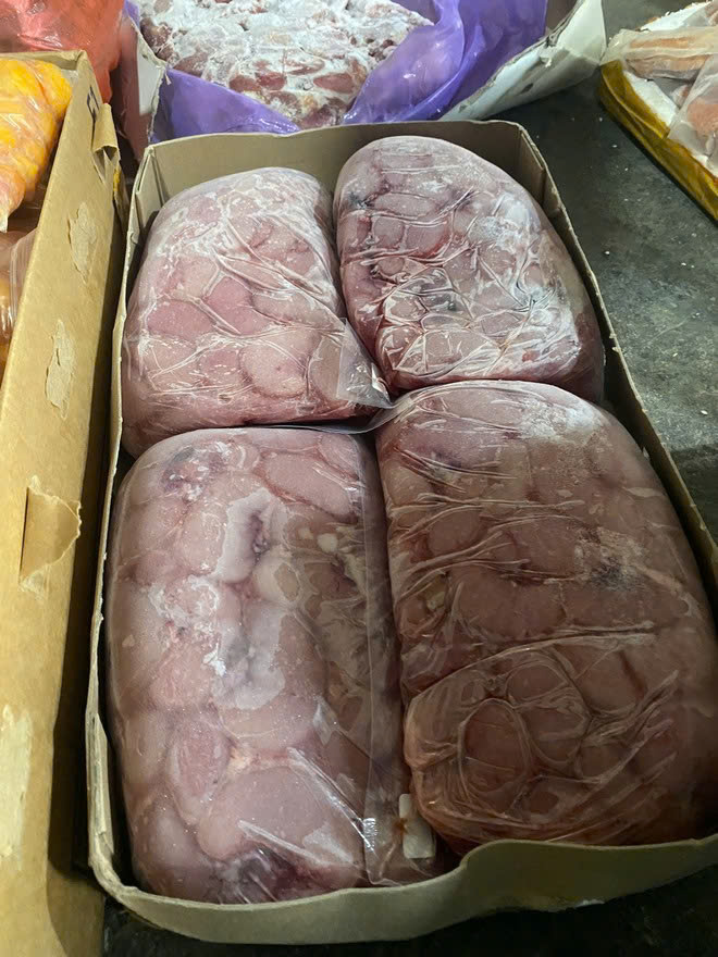 Tại thời điểm kiểm tra, tổ công tác phát hiện hơn 2,1 tấn thực phẩm đông lạnh là nầm lợn, tràng trứng, tràng lợn, kê gà, mề gà,... không rõ nguồn gốc xuất xứ, chưa được kiểm định chất lượng. Chủ cơ sở là bà P.T.H (SN: 1992), không xuất trình được giấy phép đăng ký kinh doanh, hoá đơn chứng từ số hàng hoá trên.