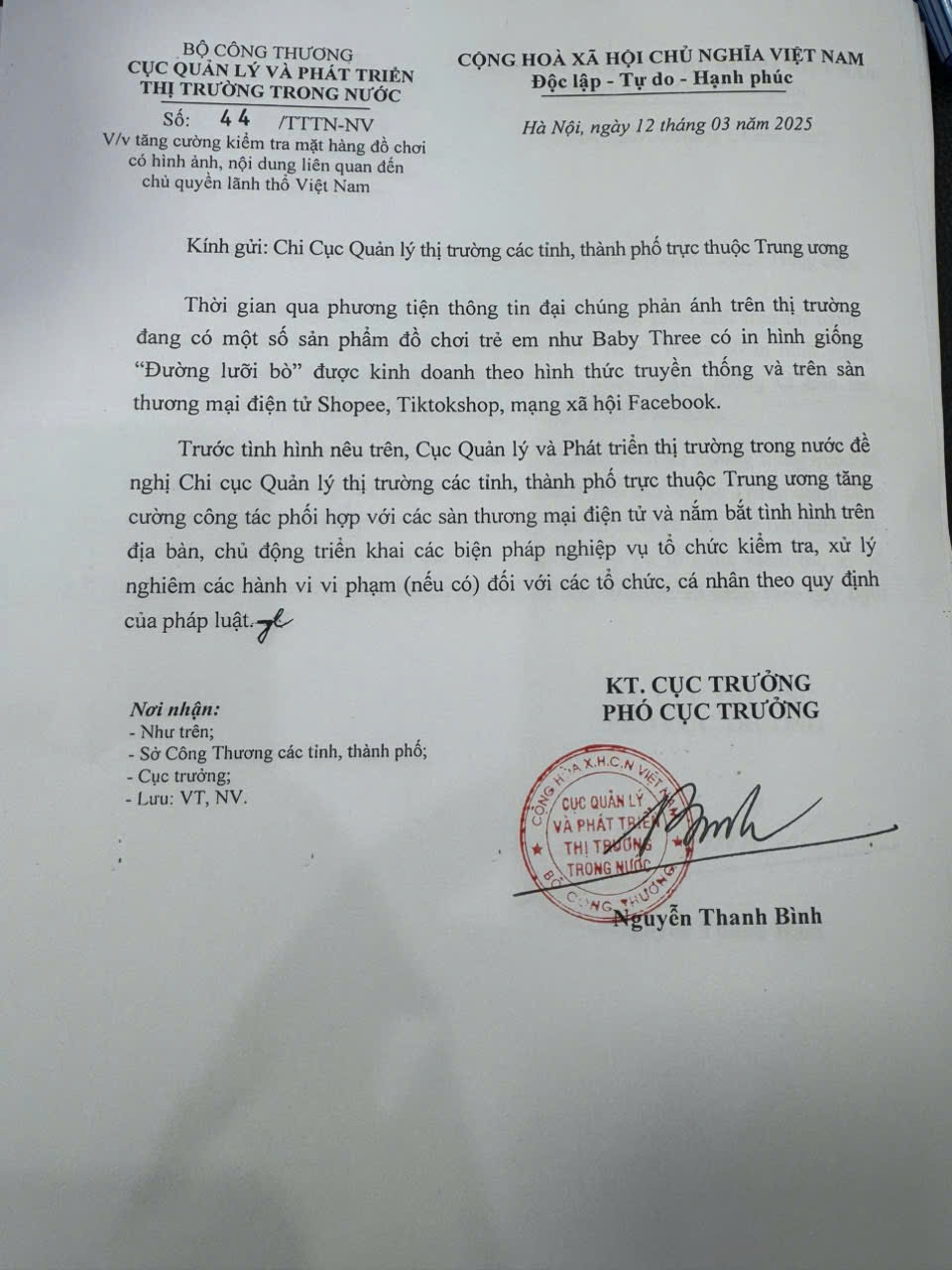 Trong Công văn gửi Chi Cục Quản lý thị trường các tỉnh, thành phố trực thuộc Trung ương, Cục Quản lý và Phát triển thị trường trong nước nêu rõ, thời gian qua, phương tiện thông tin đại chúng phản ánh trên thị trường đang có một số sản phẩm đồ chơi trẻ em như Baby Three có in hình giống “Đường lưỡi bò” được kinh doanh theo hình thức truyền thống và trên sàn thương mại điện tử Shopee, Tiktokshop, mạng xã hội Facebook.